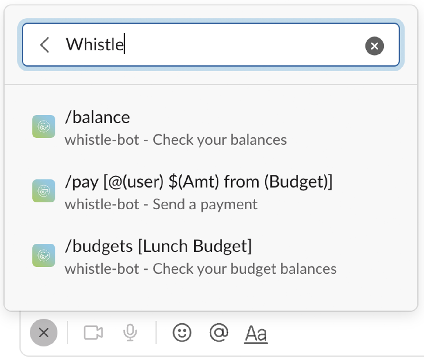 The Whistle payment tools available in Slack allow users to view budgets, send payments, and check Whistle Card balances with easy to use commands and modals.