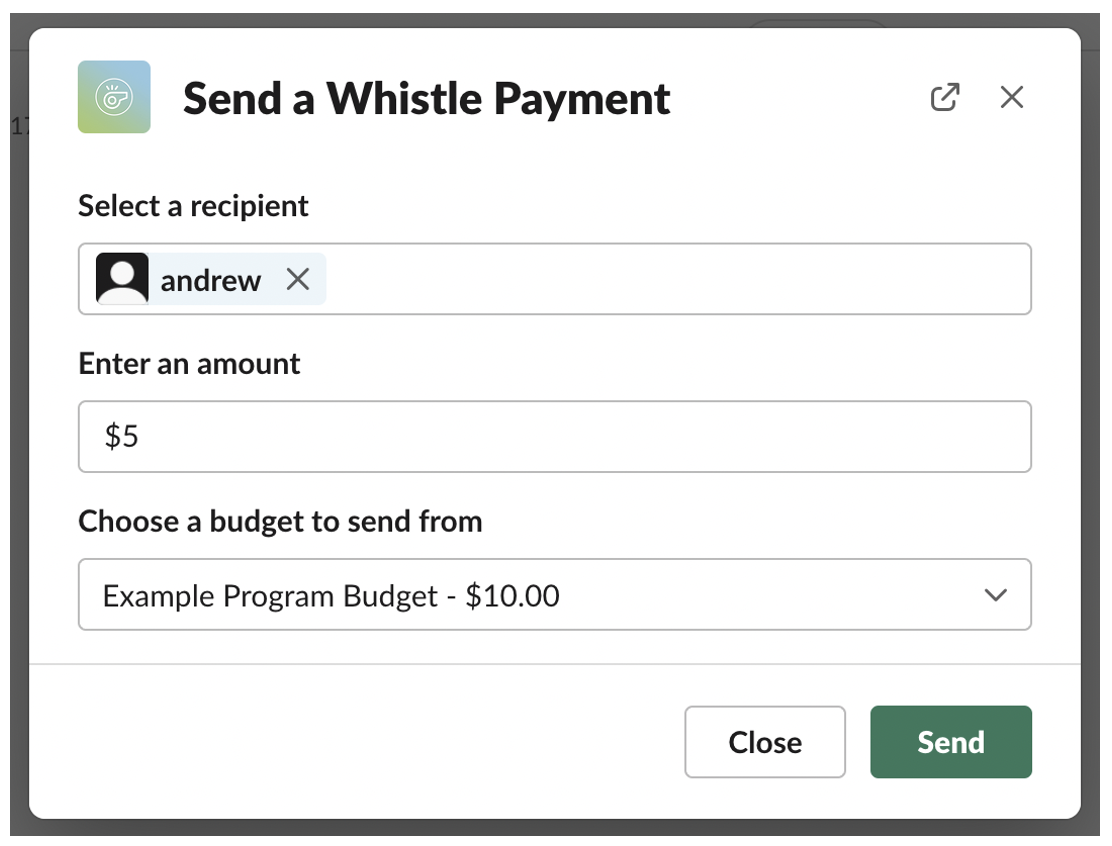 If you’re used to sending payments within Whistle, this is just as simple, but now you can do it in Slack!